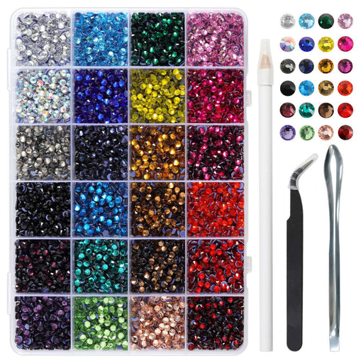 Hotfix Rhinestones Mixed 24 Colors, Rhinestones for Crafts Clothes, Hotfix Crystals with 1 Tweezers, 1 Wax Pencil and 1 Scoop