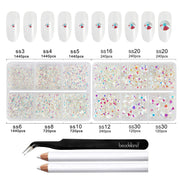 • Pack of 2 box, total 8300 pieces gold rhinestones for nails in 10 sizes,two wax pencils and one tweezer for glass rhinestones flatback.